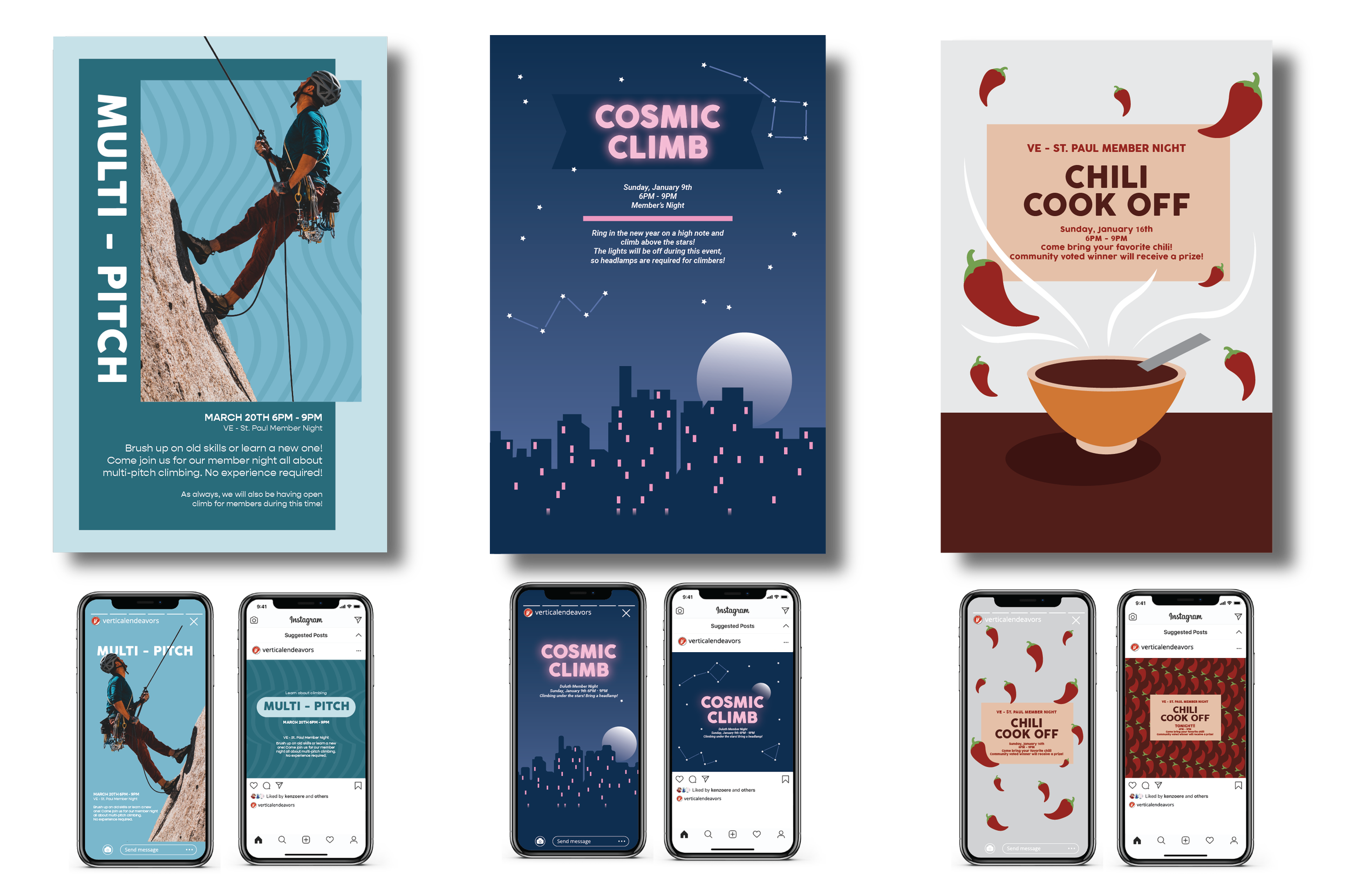 Designed posters, social media graphics, and television slides for member night events at Vertical Endeavors. Created in Adobe Illustrator and Photoshop. Working within brand guidelines (colors and fonts) to maintain Vertical Endeavors’ brand image of inviting and engaging.
